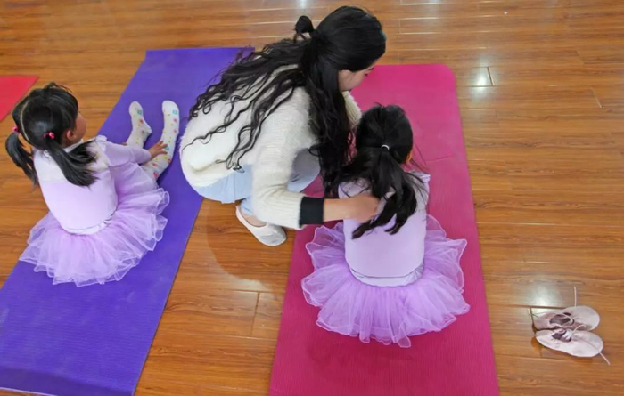 在舞蹈工作室里,程丹一招一式地指导女孩子们下腰