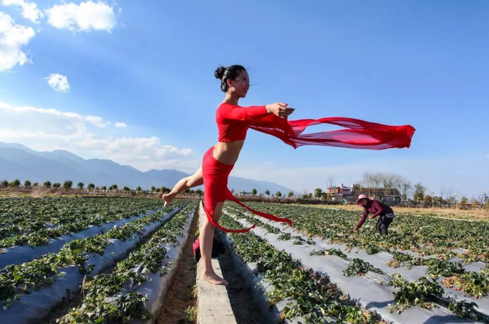 在母亲的草莓地里,程丹情不自禁地跳起舞来。母亲一边忙着采摘草莓,一边不时地抬头欣赏女儿的舞姿。