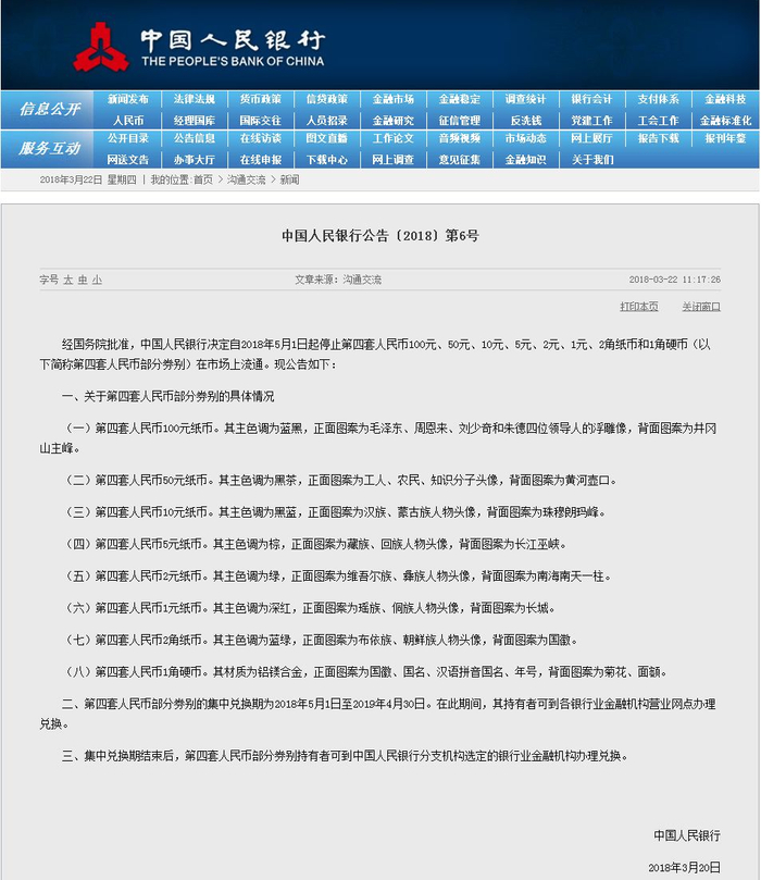经国务院批准,中国人民银行决定自2018年5月1日起停止第四套人民币100元、50元、10元、5元、2元、1元、2角纸币和1角硬币(以下简称第四套人民币部分券别)在市场上流通。现公告如下: