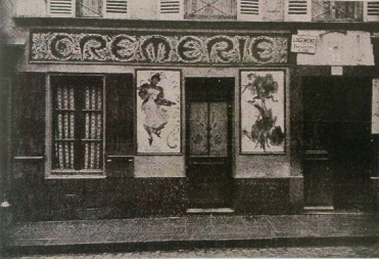 如同许多最终混出头来的艺术大师或当代创业者老套的故事情节一样,这时必然要出现个小餐馆或者咖啡厅。巴黎正巧有一个叫夏洛特夫人餐厅的小餐馆,允许穷苦的画家们赊账吃饭,拿画作抵饭钱。靠着此等福利,这家餐馆成了巴黎的一个小型艺术中心,穆夏就在这里结识了他的好友,著名画家高更。