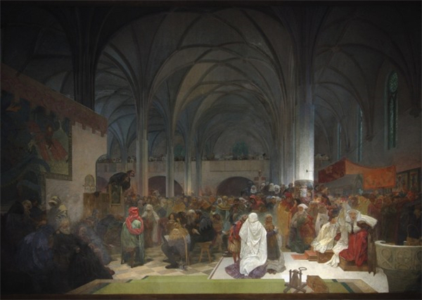 穆夏回到捷克,从1909年到1928年创作完成了20幅油画巨作《斯拉夫史诗》。在这将近二十年里,新生的捷克斯洛伐克在一战后崩溃的奥匈帝国的废墟上建立起来。
