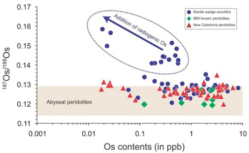 通过对比新喀里多尼亚弧前橄榄岩与地幔楔橄榄岩包体的Os同位素数据发现,当两者的Os含量都<1ppb时,部分地幔楔橄榄岩包体具有明显高的187Os/188Os比值,而新喀里多尼亚弧前橄榄岩的187Os/188Os比值没有发生显著升高。这表明放射性成因的Os并没有显著地从俯冲板片转移至弧前地幔中,从而暗示尽管俯冲板片弧前脱水可以释放富Cl的高氧化性流体,但Os元素在这种流体中是不活动的。研究提出,造成弧前橄榄岩与地幔楔橄榄岩包体的Os同位素的这种差异,可能反映了俯冲板片在不同深度脱水或熔融时,硫化物在板片具有不同的稳定性,导致Os具有不同的活动性。俯冲板片在浅部发生脱水时,由于硫化物在板片中保持稳定,因此Os被保留在板片中而不会随释放的流体加入到上覆的地幔楔中。但在更深的部位,俯冲板片可能发生熔融或释放超临界流体,此时硫化物将变得不稳定而发生分解,导致Os随熔体或超临界流体加入到地幔楔中。这一观点可以很好地解释堪察加岛弧岩浆所携带的、来自不同深度地幔楔橄榄岩包体的187Os/188Os比值变化,即来自浅部受俯冲流体交代的橄榄岩样品具有与正常地幔类似的187Os/188Os比值,而来自深部遭受俯冲熔体交代的橄榄岩样品则具有明显升高的187Os/188Os比值。