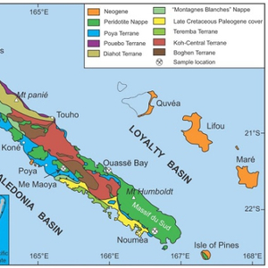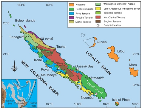 图1.新喀里多尼亚地质图及采样点