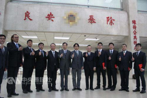 台湾“警政署刑事局”23日举行“斩手行动项目”记者会。“刑事局长”蔡苍柏(左5)表示,从3月19日至22日执行第二波全台查缉车手“斩手”项目,4天逮捕418人。台湾内务部门负责人叶俊荣(右6)23日赴“刑事局”表扬有功警察。图片来源:“中央社”