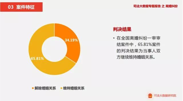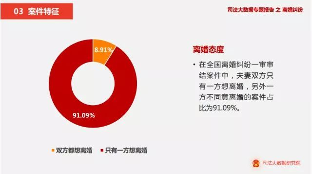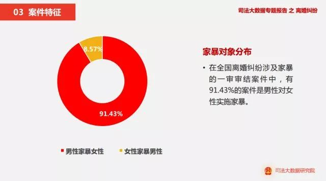 报告显示,两年来,在全国离婚纠纷一审审结案件中,73.40%的案件原告为女性,年龄相差0至3岁的夫妻最多。广东、贵州和广西涉及家暴的案件量排名靠前,91.43%的案件是男性对女性实施家暴,家暴方式主要以殴打、打骂和辱骂为主。夫妻双方只有一方想离婚,另外一方不同意离婚的案件占比为91.09%。65.81%案件的判决结果为当事人双方继续维持婚姻关系。