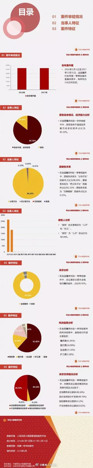 报告统计,在全国赡养纠纷一审审结案件中,原告身体不佳或经济能力较差的案件占比为85.50%。原被告关系为“父母子女”的案件占比为98.20%;原被告关系为“养父母子女”的案件占比为1.15%;原被告关系为“兄弟姐妹”的案件占比为0.21%。“被告”的主要身份为“儿子”和“女儿”。“被告”为“儿子”的占比为58.34%。诉讼请求主要为金钱给付赡养案件,占比95.93%;金钱给付内容主要包括赡养费、医疗费、生活费、护工费等。