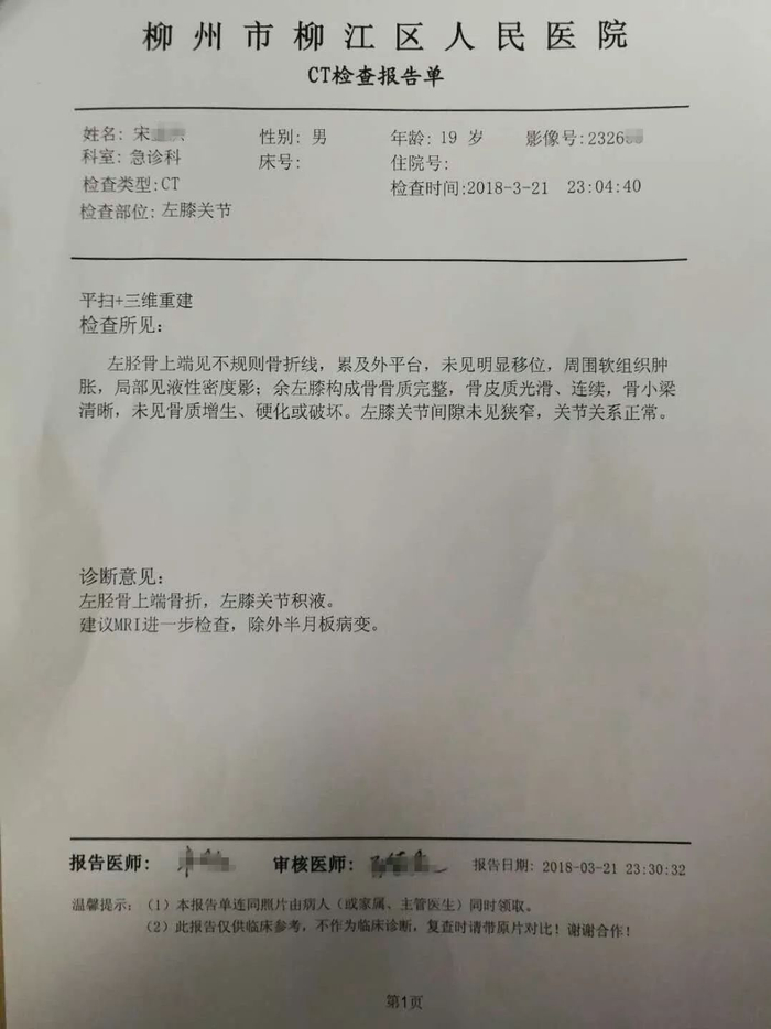 据了解,事发当天白天,宋某骑电动车外出时不慎自翻受伤,前往柳江区人民医院检查发现,其大腿骨骨折。