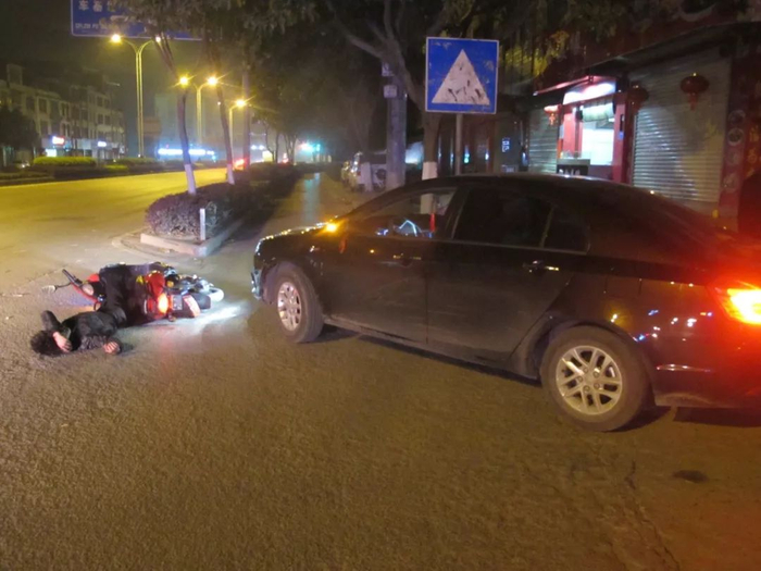 民警调阅智能交通系统监控,还原了事发全过程:事发时间,一男子骑电动车进入画面,将电动车故意摔倒在地,随后一辆黑色小轿车驶来紧挨电动车停下,一会儿,骑车男子扶着另一男子一瘸一拐走来,紧挨着电动车睡躺在地。