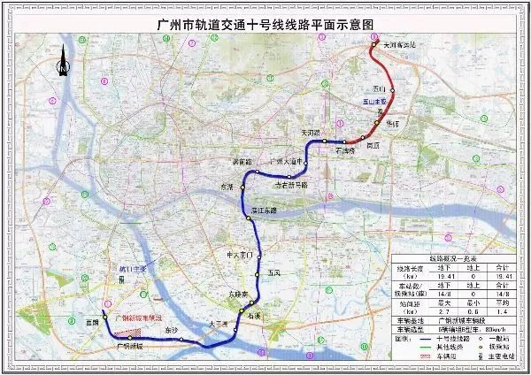 地铁十号线呈东北至西南走向,起于现有的天河客运站,终于现有的西朗站,线路全长约25.46公里,均为地下铺设,主要行经城市核心区,贯穿天河商业中心、珠江新城、五羊新城、北京路文化核心区、东沙医药港、广钢新城等重点区域。