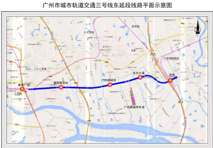 三号线东延段呈东西走向,起于三号线的番禺广场站,终于四号线的海傍站,线路全长约9.58公里,均为地下敷设,共设4座车站,分别是:番禺客运站、广州新城西、金光大道和海傍(除已运营车站外,其余站名均为工程暂定名),其中海傍站与四号线换乘。列车采用与三号线一致的6节编组列车。