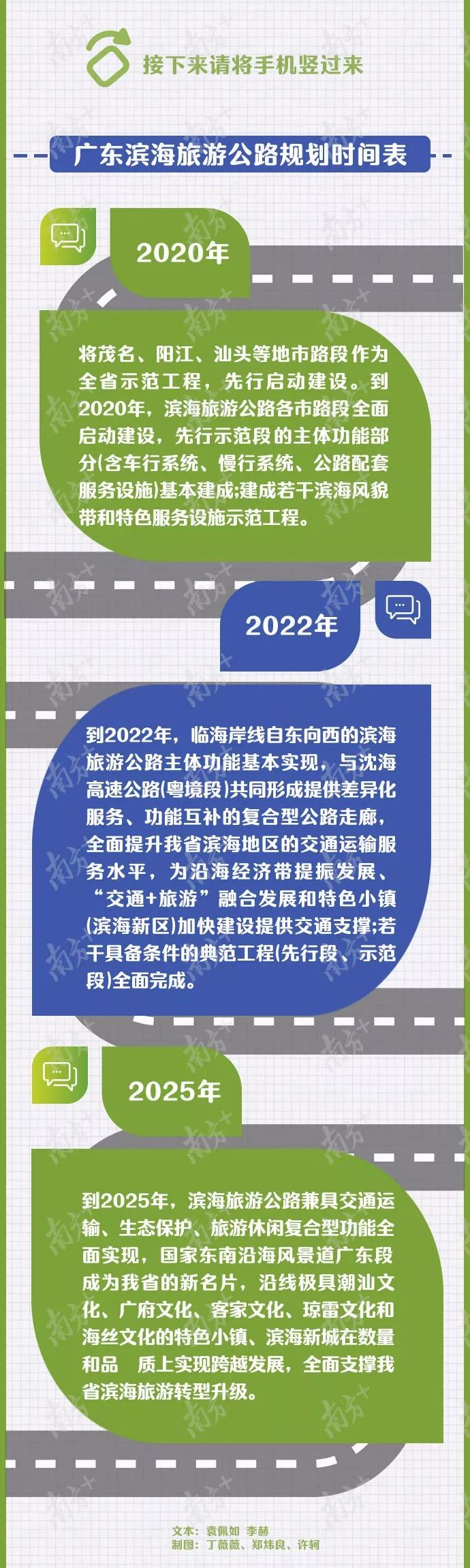 按照《规划》,2020年,广东滨海旅游公路各市路段将全面启动建设,到2025年,滨海旅游公路兼具交通运输、生态保护、旅游休闲的复合型功能将全面实现,全面支撑起我省沿海经济带的发展。