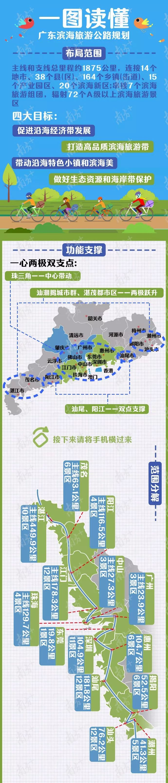 日前,广东省交通运输厅公布了《广东滨海旅游公路规划》,广东将打造全长1875公里,全球最长的广东滨海旅游公路。据了解,该公路将连接14个地市、38个县(区)、164个乡镇(街道)、15个产业园区、20个滨海新区,串接7个滨海旅游组团,辐射72个A级以上滨海旅游景区。