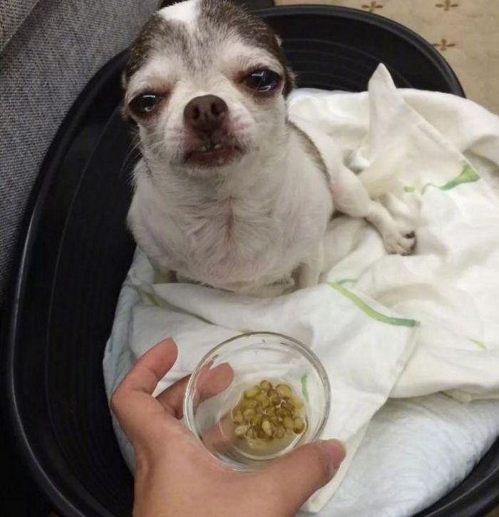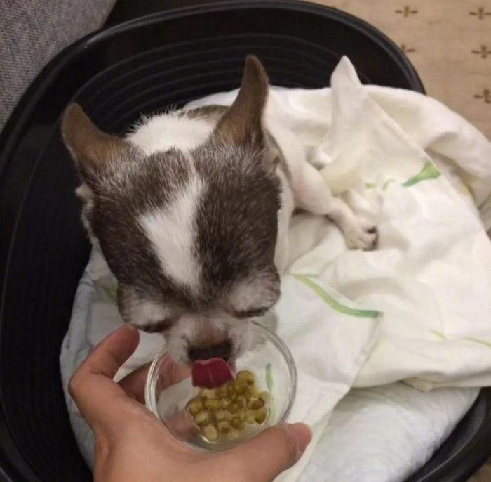 当它吃完主人喂的绿豆汤时,满眼都是泪水。