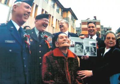 2005年8月,黄欢老人和当年飞虎队老兵重逢于昆明,笑逐颜开。