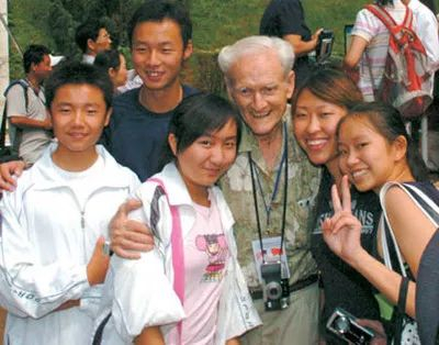 一位美国老兵和几位中国学生合影