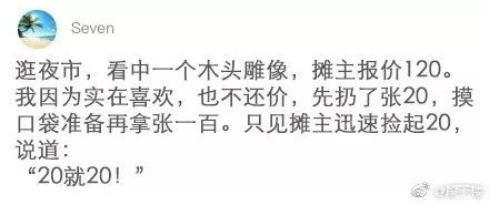 @Mr·欢:摆夜摊卖几个艺术品,木头雕像2元进价,卖120,卖了几天卖不出去,今天突然有人问多少钱,在他掏出20块钱的时候我就知道我要赢了……