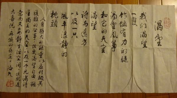 洛老给我写的那件《因为风的缘故》的书法条幅被好朋友看见后喜欢而“夺”去,2017年1月去看他时,他的眼睛正好有些毛病,洛老跟我说,我好了再给你重新写一张,言犹在耳,历历在目,但洛老已不能再为我提笔。今天翻看他送我的其它书法作品,有一张写道:“我们渴望一双,蚱蜢有力的腿,渴望风筝和他的天空,渴望诗与远方,以及一只风平浪静的枕头。——人有极大的能量,以应付极其复杂的世事,但更渴望自由,拥有独立的天空,以及一个充满诗意而又安静生活空间,这就是大喜悦,无憾的存在”,相信此刻的洛夫已得到大喜悦,也无憾于他的一生。