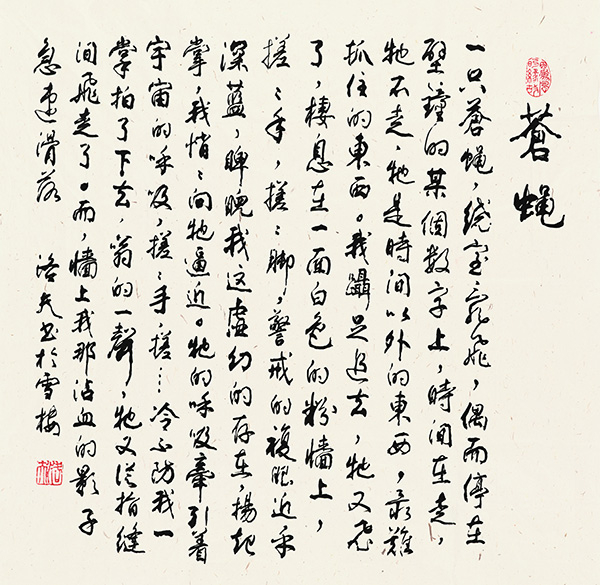 2016年10月25日我去台湾,洛老先请我在台北的喆园吃饭,第二天我已有晚宴,洛老仍坚持还要请我吃饭,却之不恭,当天只得吃了两顿晚饭。17年1月13日我再次去位于台北101附近的庄敬路197巷他家,很少请人在家吃饭的洛老让夫人做了菜请我在家吃饭,师母的菜做的好吃,狮子头我一气吃了三个。隔了一天,又请我与方明等一起去吃他家乡的湖南菜,而且每次跟朋友介绍我,也必说是老朋友,由此可见被誉为“知世故而不世故”的洛夫待友之真诚,为人之热情。有时,他也会用微信给我发很长的信,我跟他说有机会还是希望他用笔给我写信更好。本来4月12已订了要去台湾,想着又可以见面,未料竟已是天人永隔,想起他那带点乡音的声音,只能在微信的语音中再听到了。定于4月11日下午在台北殡仪馆景仰楼至真厅举行的送行仪式,由于我在上海主办12日开幕的中日书法展也无法前去,只能以心香一瓣,遥祭老友了。