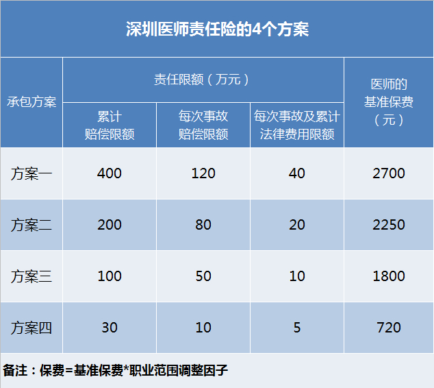 上述的4个承保方案只列出了基本保费,医生实际上要掏多少钱,还得算上“执业范围调整因子”和“医师职称调整因子”。这也是深圳版保险的一个特色。