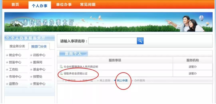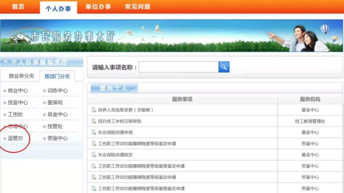 2.点击“个人办事”进入网页后左侧选择“按部门分类”下“退管办”选项;