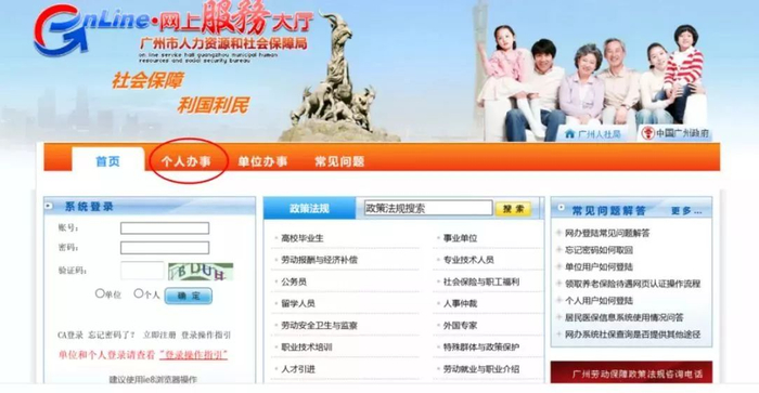 1.输入广州市人力资源和社会保障局网上服务大厅(http://gzlss.hrssgz.gov.cn/Index.shtml)进入网站;