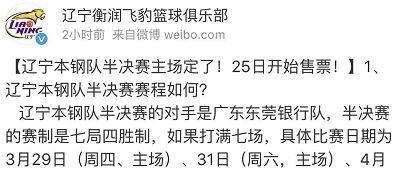 辽宁本钢队半决赛前两个主场(29日、31日)