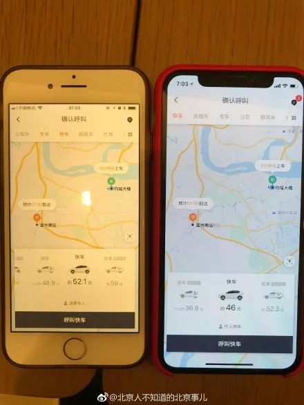 近日,有网友发现,同一段路程,打车软件对两部手机的报价却不一样: