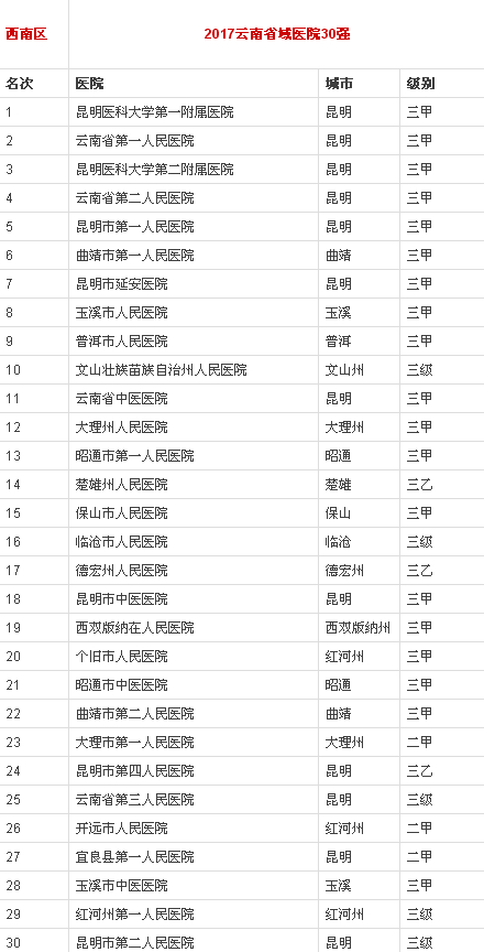 云南省域医院30强名单如下