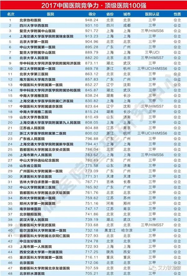 “2017中国医院竞争力排行榜”从医疗技术、学术影响力、资源配置(规模和内部配置)、服务能力及医院运行等方面,以大数据为工具,对医院进行综合评价分析而进行排名。