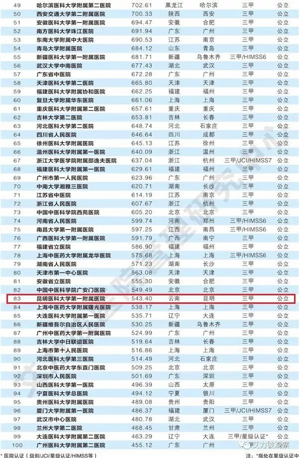 厉害!昆医附一院跃居全国第83名 云南医院30强都在这了