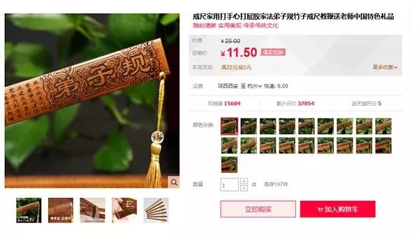 在某购物网站上搜“戒尺”,跳出很多链接。生意最好的一家,月销量高达15604笔。价格都在7-15元。看看评价,里面有不少精彩的买家秀。