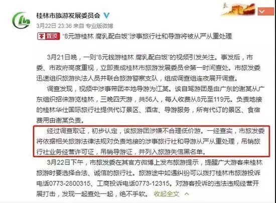 然而,所谓“反转”,其实并不影响该旅游团涉嫌“低价游”的事实。“8元游桂林午餐腐乳配白饭”事件近日闹得沸沸扬扬,一切还得从3月23日网上曝出的一段视频说起。