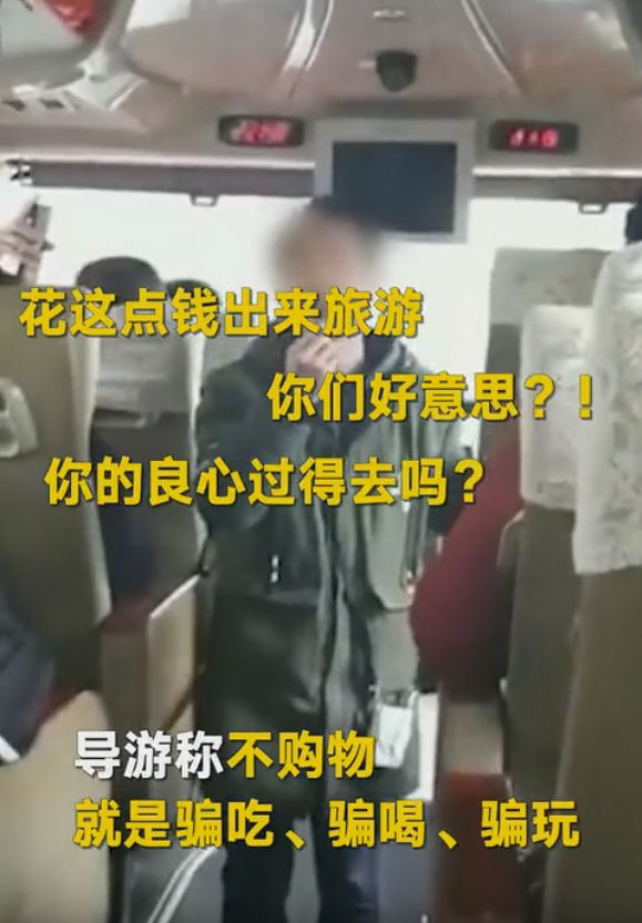 视频中,在大巴车上的一位男性导游回应了游客的不满,“拿这点钱出来旅游,还不消费、不买东西,你们良心过得去吗?”他甚至还称游客“骗吃!骗喝!骗玩!就是旅游流氓。”