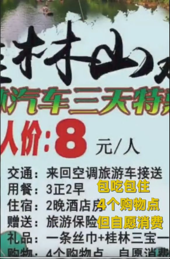 而在视频中的一份广告单显示,8元团购价包括:交通:来回空调旅游车接送;用餐:3正2早;住宿:2晚酒店房;在购物方面,旅程共有4个购物点,均是“自愿消费”。