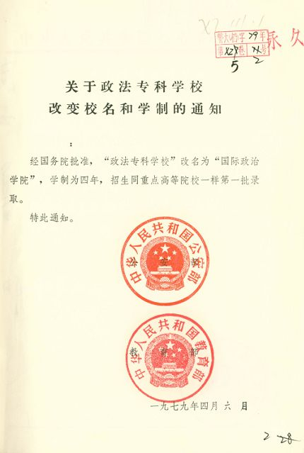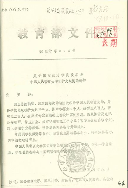 教育部《关于国际政治学院改名为中国人民警官大学和扩大规模的通知》