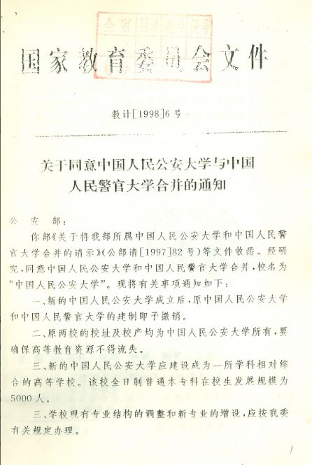 上个世纪九十年代末,从国家高等教育改革的总体思路出发,公安部党委决定将中国人民公安大学和中国人民警官大学合并。1998年2月24日,国家教育委员会批复同意两校合并,校名为中国人民公安大学。新的中国人民公安大学成立后,原中国人民公安大学和中国人民警官大学的建制撤销,原两校的校址及校产均为新中国人民公安大学所有,分木樨地校区和团河校区。