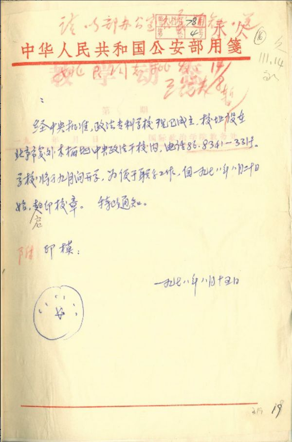 1月,国务院委托教育部批准,将中央人民公安学院改建为全日制性质的中国人民公安大学。邓小平同志为学校题写校名。