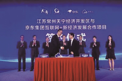 2016年11月,京东集团与江苏省人民政府签署“互联网+”战略合作协议,共建“一基地四中心”,合作涉及互联网与现代物流、智能制造业、数据服务、“三农”、商贸流通、创业创新、医药、金融等诸多领域。2017年9月20日,京东集团与常州天宁区经济开发区签署“互联网+”新经济发展合作项目合同,京东云苏南运营中心也同时落户常州。2018年1月26日,天宁区·京东云“互联网+”新经济生态合作企业签约仪式在常州圆满成功。2018年2月28日,京东云助力“常州智造”亮相2018年上海经贸活动周。京东云充分发挥龙头效应,凭借云计算、大数据等领域技术优势与经验积累,形成产业集聚,为加快常州经济转型发展赋能。