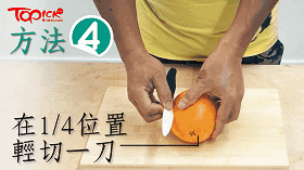 方法三:在橙子的1/4处轻切一刀,共切四刀,沿四条开口剥下即可。