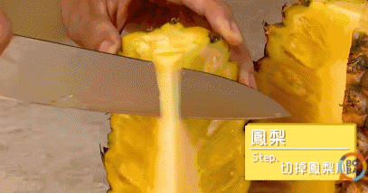 去掉菠萝中间的部分,用刀划过表皮,将果皮和果肉分离,依次切4次就可以啦。