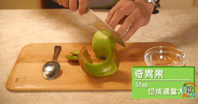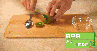 切去猕猴桃的两端,在果皮上轻划一刀,用勺子从划开的部分不断向内侧挖,果皮部分就可以去掉。