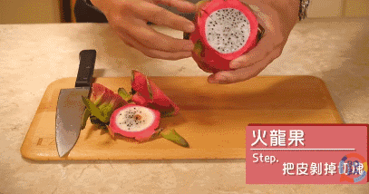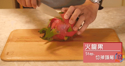 切掉火龙果的头尾部分,再用刀在果皮上轻轻切一刀。