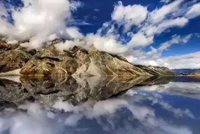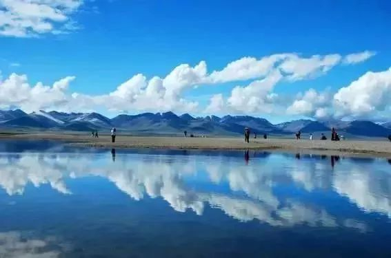 在纳木错,天空碧蓝,云彩蔓延到青绿色的湖水上,镜子般的湖面倒映出岸边的巨石、经幡和空中的彩霞。在这样的美景中,人的内心会感到从未有过的宁静。
