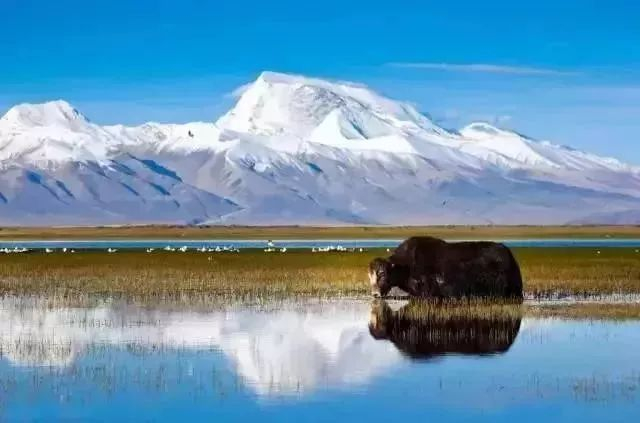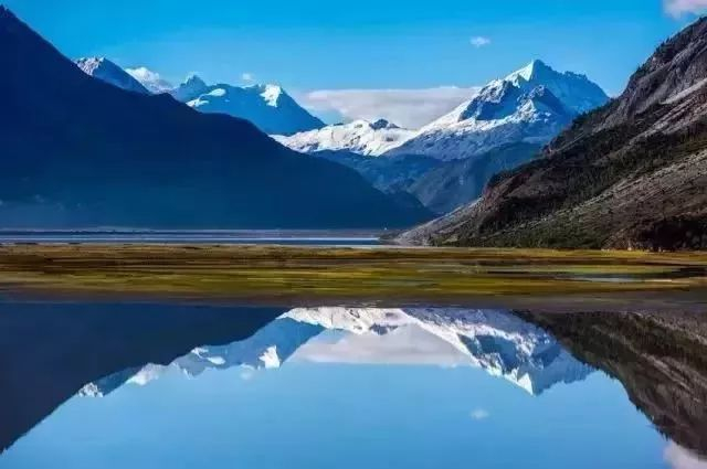 沱沱河是长江的正源,源头处的景观十分壮丽,雪山冰峰、一望无际的草地、蓝天白云在河水里随波荡漾……