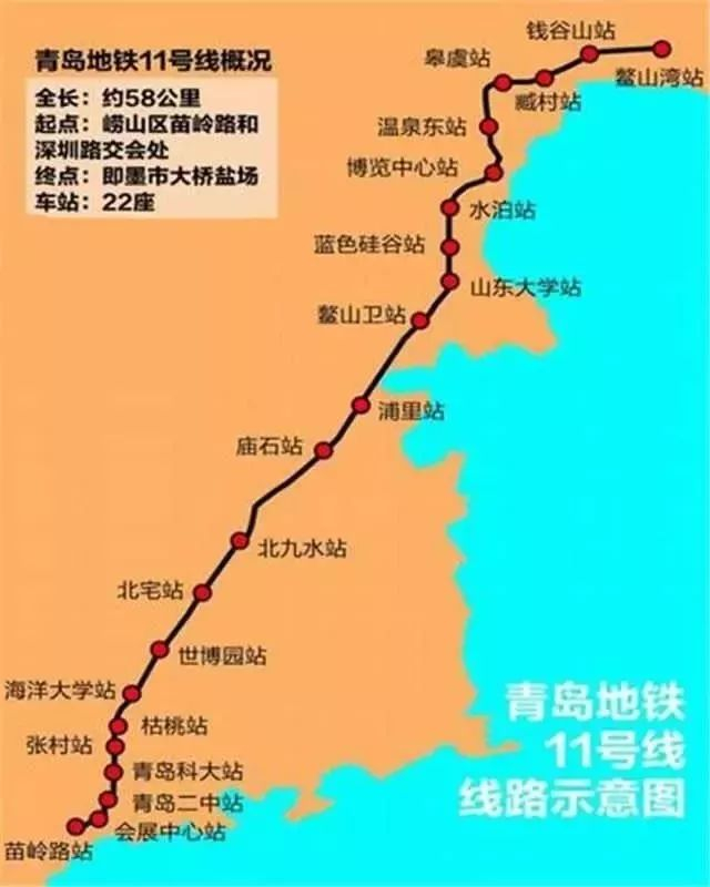 ◉ 苗岭路站—◉ 会展中心站—◉ 青岛二中站—◉ 青岛科大站—◉ 张村站—◉ 枯桃站—◉ 海洋大学站—◉ 世博园站—◉ 北宅站—◉ 北九水站—◉ 庙石站—◉ 浦里站—◉ 鳌山卫站—◉ 山东大学站—◉ 蓝色硅谷站—◉ 水泊站—◉ 博览中心站—◉ 温泉东站—◉ 皋虞站—◉ 藏村站—◉钱谷山站—◉ 鳌山湾站