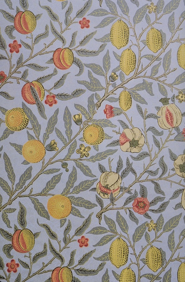 缠绕的树叶、小鸟、满是玫瑰的花棚,还有果树树枝,威廉·莫里斯的设计有一种超越时间的魅力。他从1862年开始设计墙纸,但是他们的买卖推迟了几年,因为他当时还在进行锌版印刷的实验。