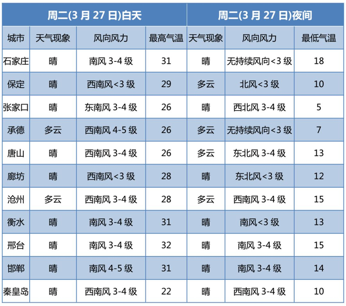 27日,张家口北部、承德北部有偏南风5-6级,阵风7级,伴有扬沙,其他地区有偏南风3-4级;