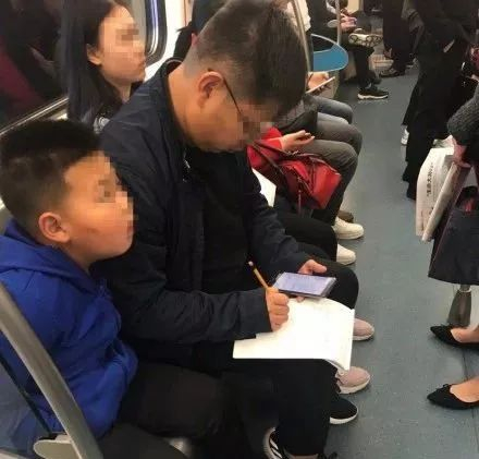 亲爸!早高峰地铁上专心致志检查儿子作业