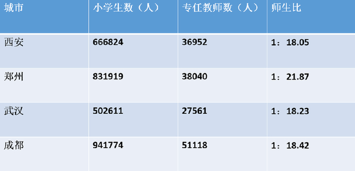 当然,单纯的学校数量并不代表教育水平,但如果用教师与学生之间的师生比来计算的话,2017年西安市小学在校学生666824人,小学专任教师36952人,小学的师生比约1:18.05,即1名老师带18个学生,这一比例也要略好于成都、武汉和郑州。