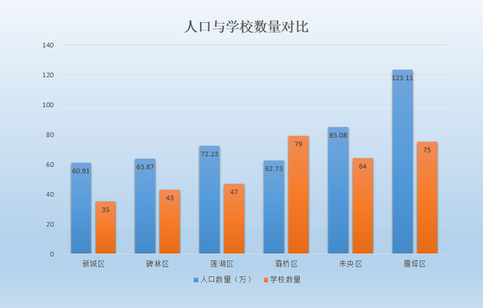而在城六区内部也是如此,灞桥区的人口最少,小学数量反而最多,与灞桥区人口数量差不多的新城区,小学的数量却不到前者的一半。